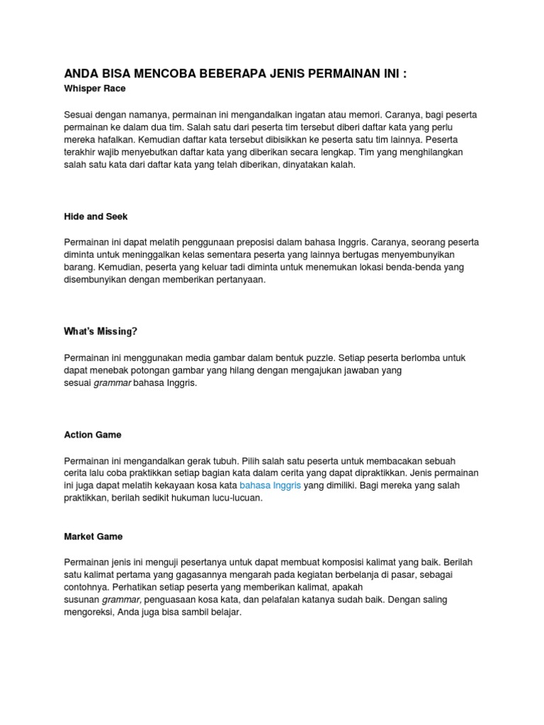 Lelaki itu melakukannya dengan cepat. Ibu berkata kepada kakak untuk membersihkan kamarnya.b. Masuk untuk melihat game favorit anda di sini! Penerapan metode kooperatif learning tipe two stay two stray dan permainan kalimat berantai untuk meningkatkan keterampilan menulis karangan. Setelah kami menjelaskan tentang identitas nasional, kami mencoba untuk mereflesikan materi yang telah didapat dengan kami membuat game dari kalimat berantai yang sudah kami siapkan.
